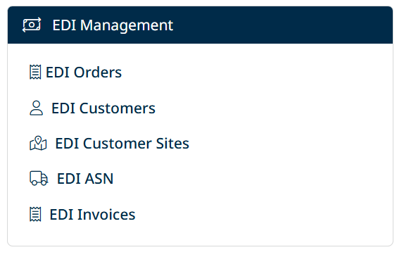 The EDI module provides a centralized platform for managing all electronic transactions between your organization and its customers. It ensures accuracy, efficiency, and visibility across the full order-to-cash process. The module is divided into four key areas: