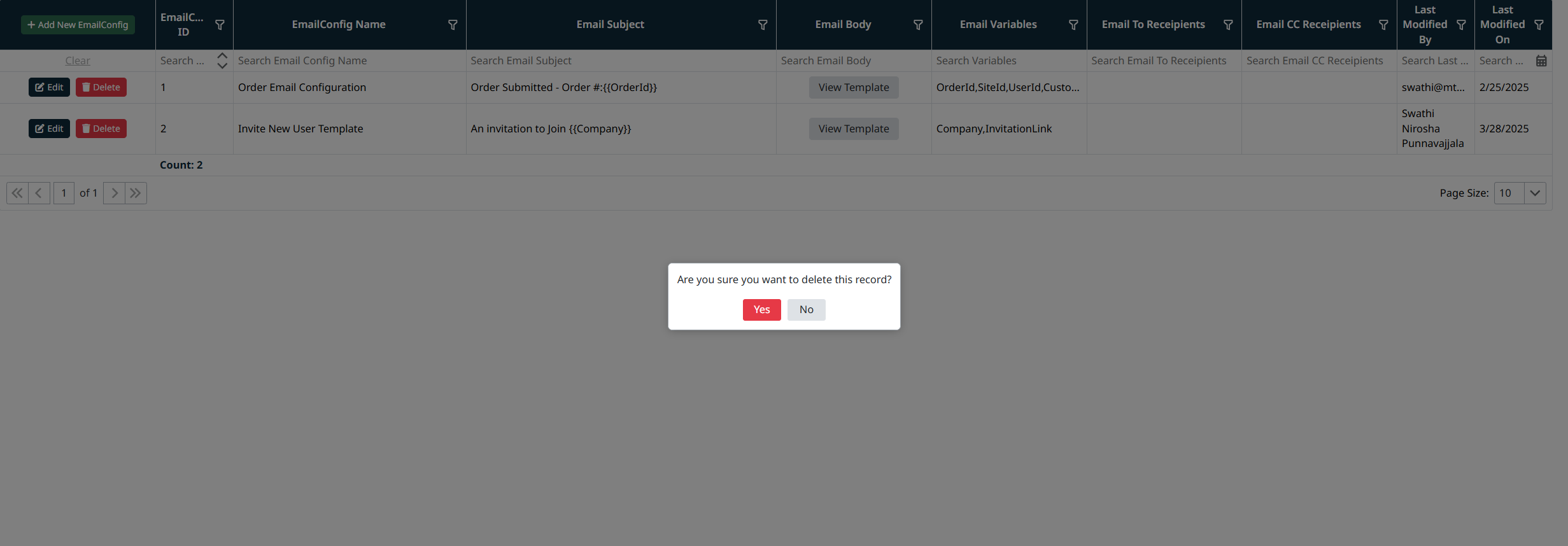 Deleting an email configuration may impact automated system notifications that rely on this template.
