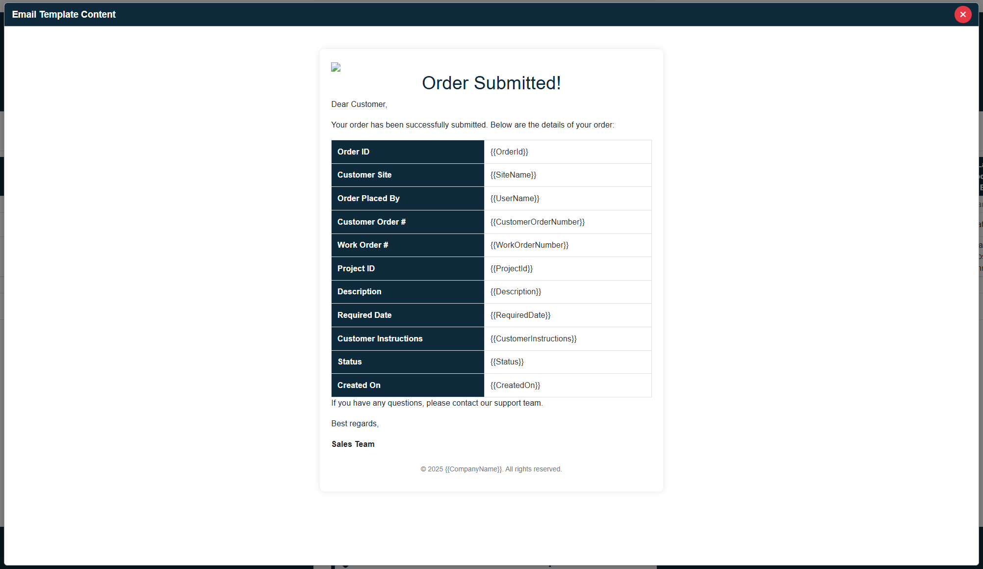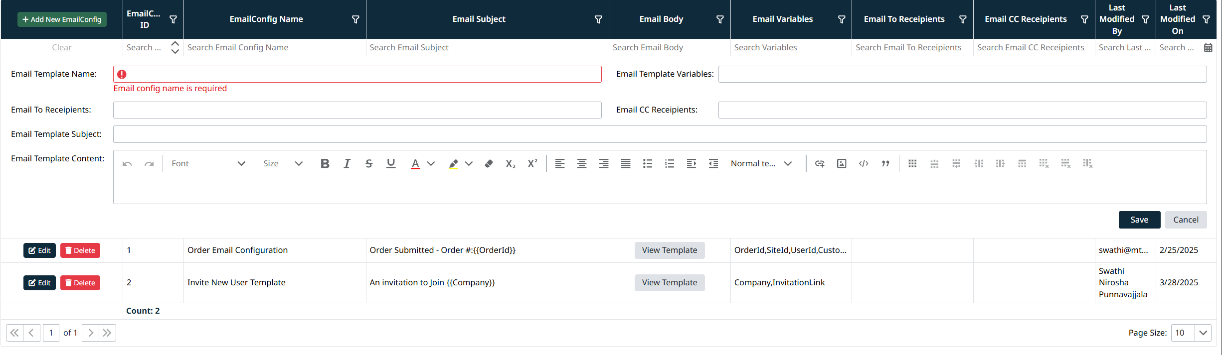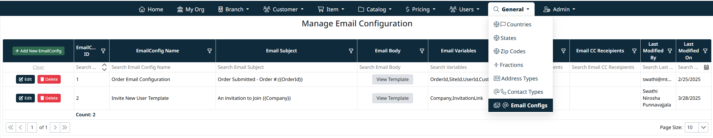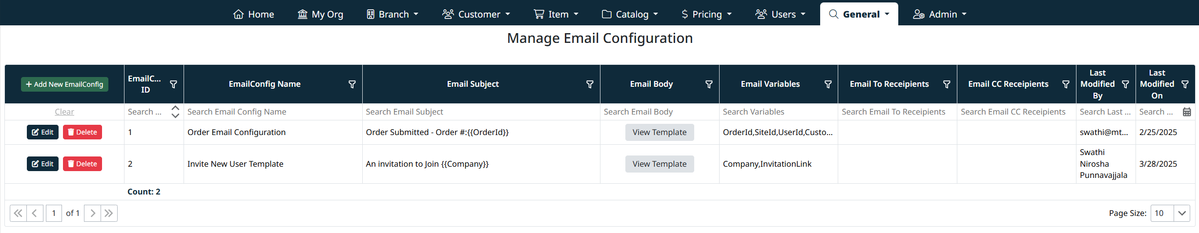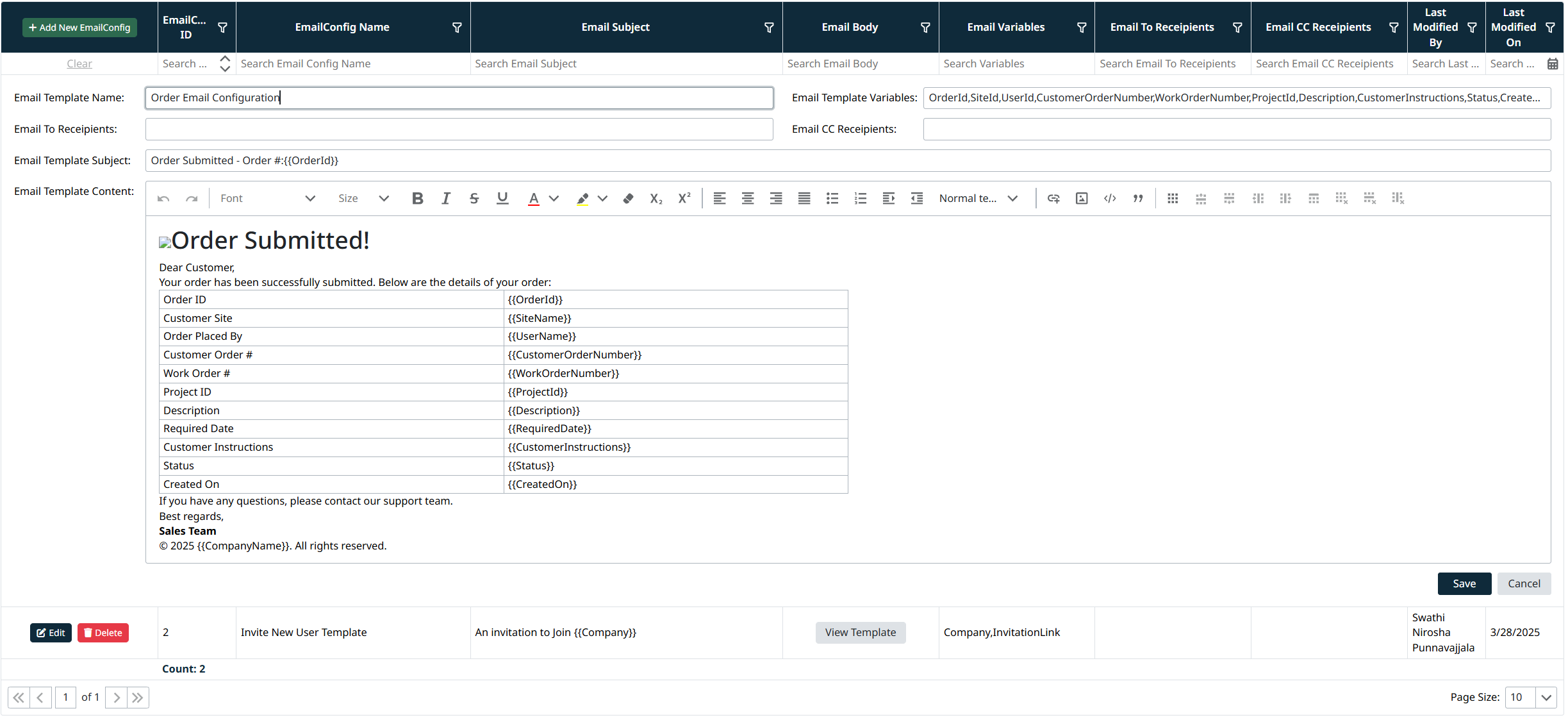 The Email Configuration screen allows administrators to create and manage automated email templates used throughout the system. These templates are triggered by system events such as order submissions or user invitations and ensure consistent, professional communication with customers and users.
