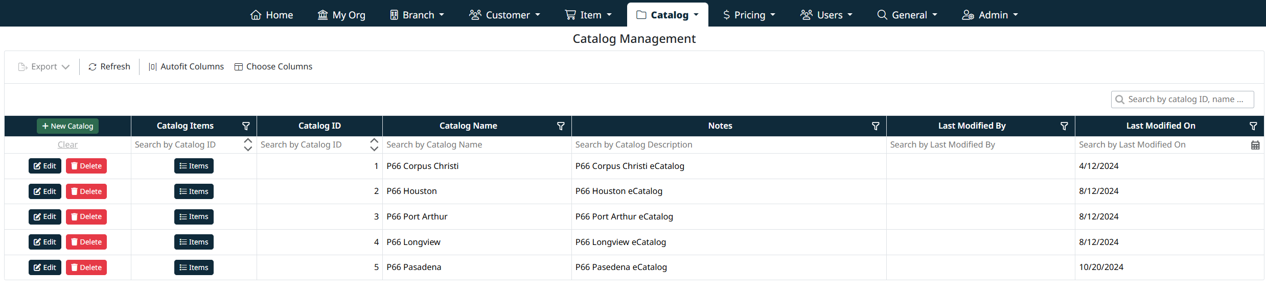 Note: Catalogs that are actively used by customers, sites, or pricing configurations may be restricted from deletion depending on system rules.