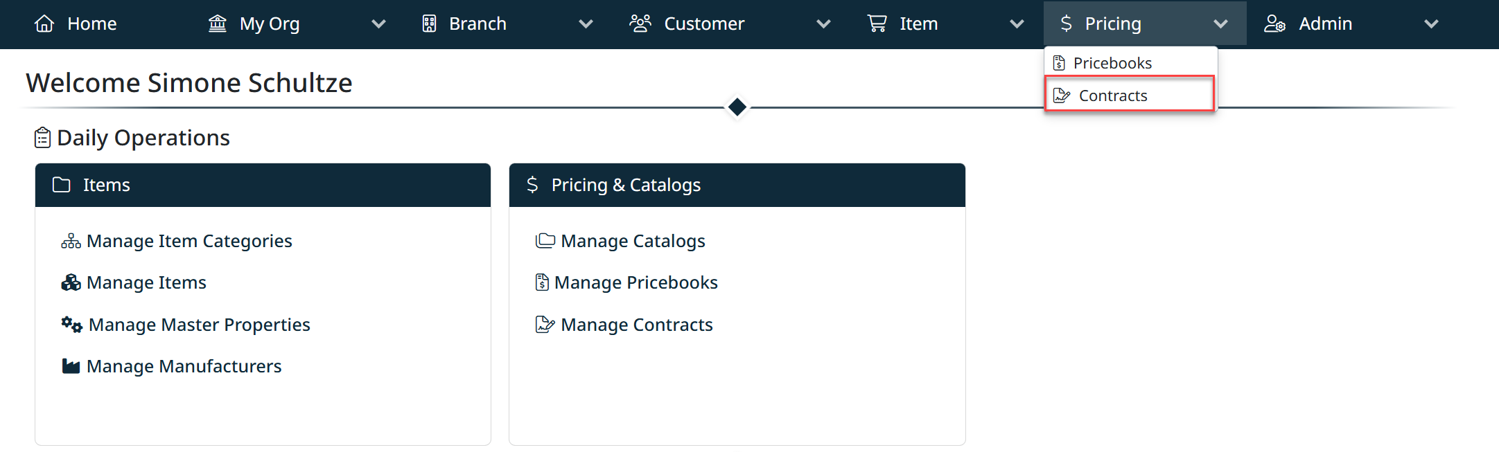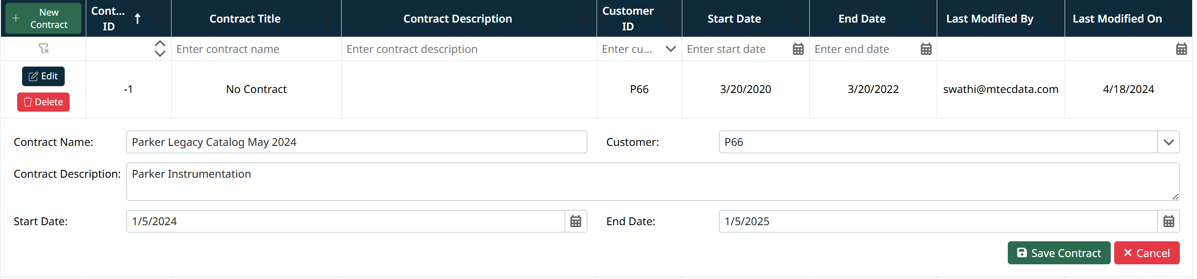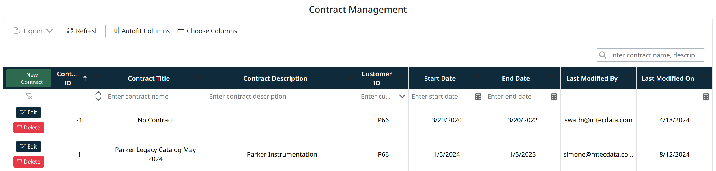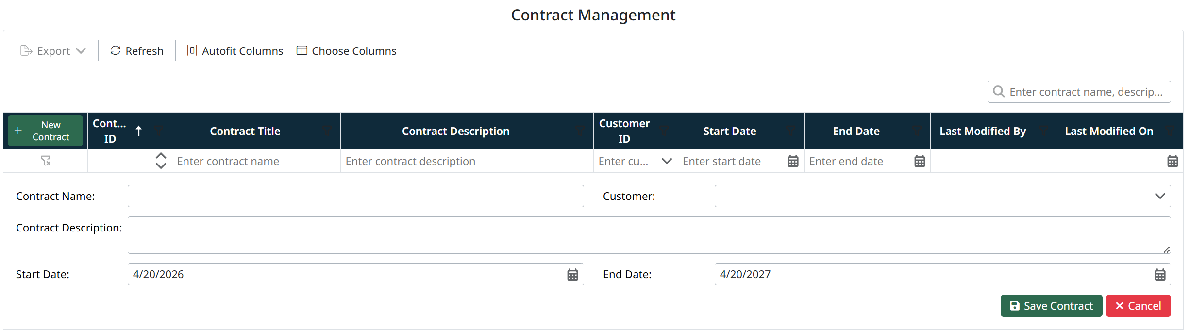 The Contract Management screen allows you to create, view, and manage contracts that control customer-specific pricing and validity periods.