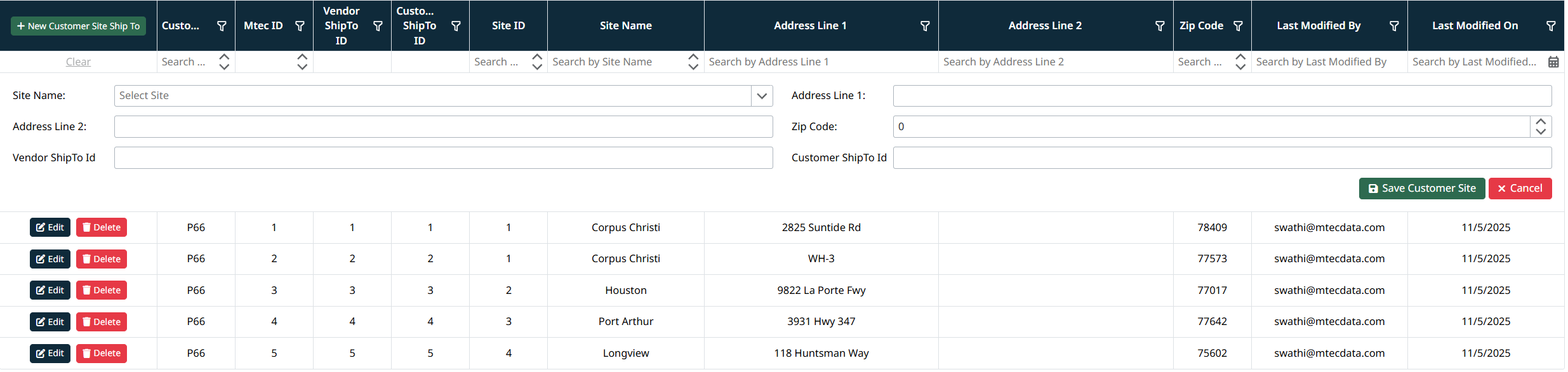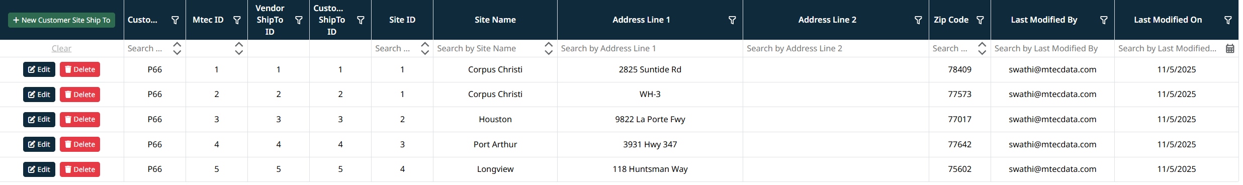 The Customer Site Ship To Management grid will display all existing Ship To mappings.