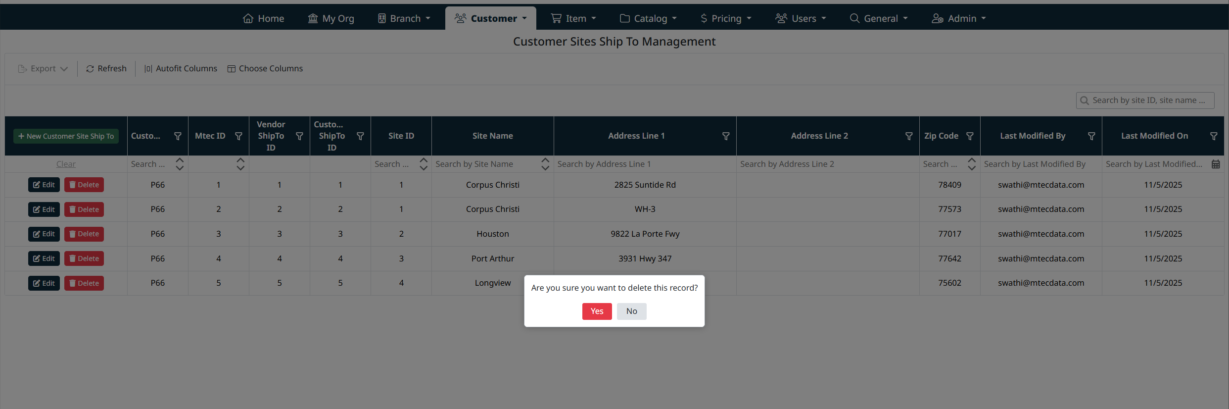 - Click Delete next to the Ship To record.