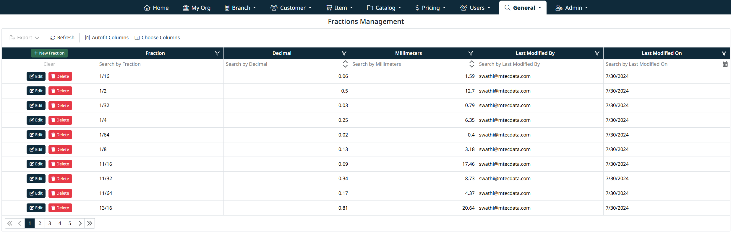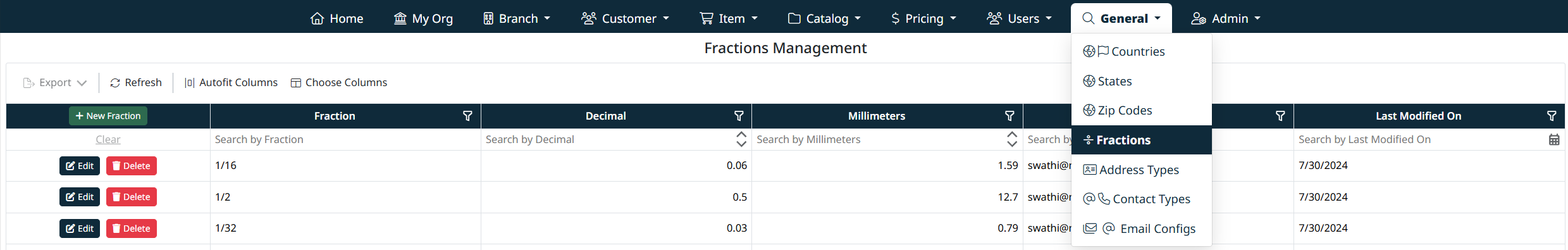 The Fractions Management screen allows you to manage fractional values used throughout the system, including their decimal and millimeter equivalents. Fractions are typically used for item dimensions, specifications, and technical measurements where precise conversions are required.