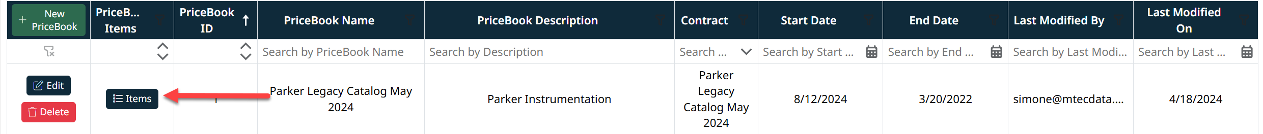 - Click the Items button in the PriceBook Items column for that pricebook