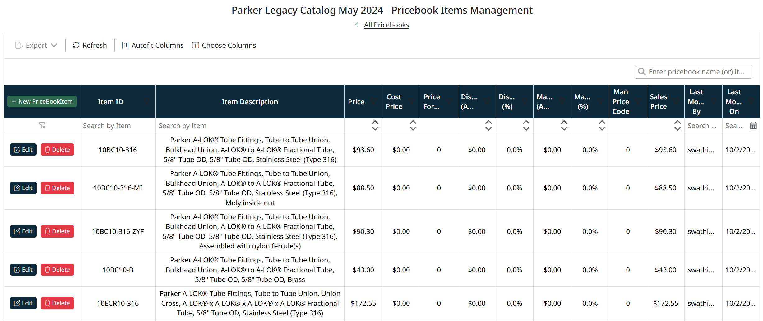 Each pricebook contains a list of associated items, which can be accessed directly from the PriceBook Management grid.