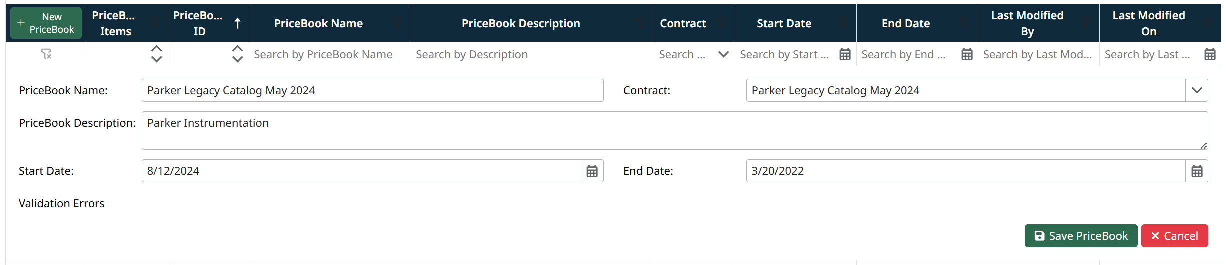 - Locate the desired pricebook in the grid