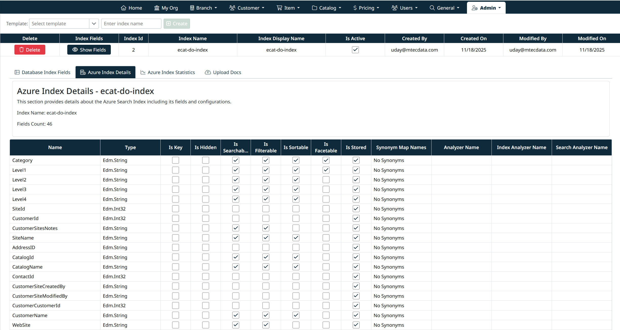 The Azure Index Details tab displays the underlying Azure Search index configuration.