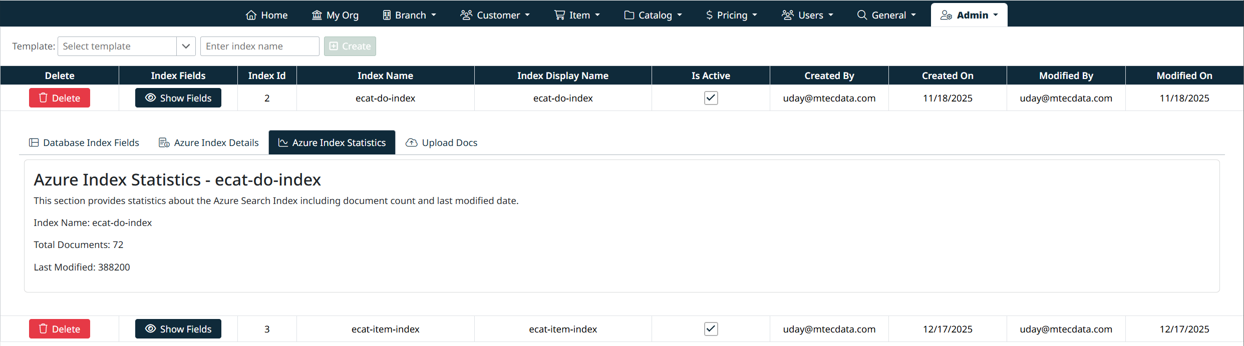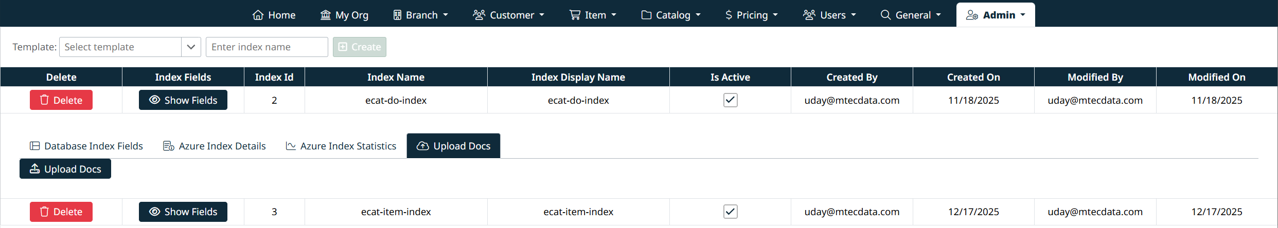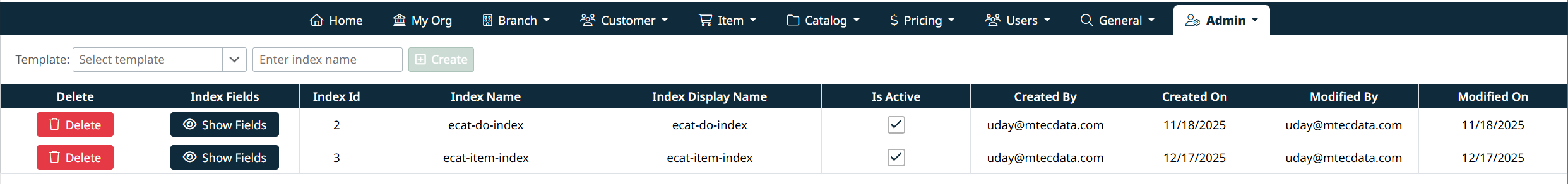 - Create – Create a new index using a template
