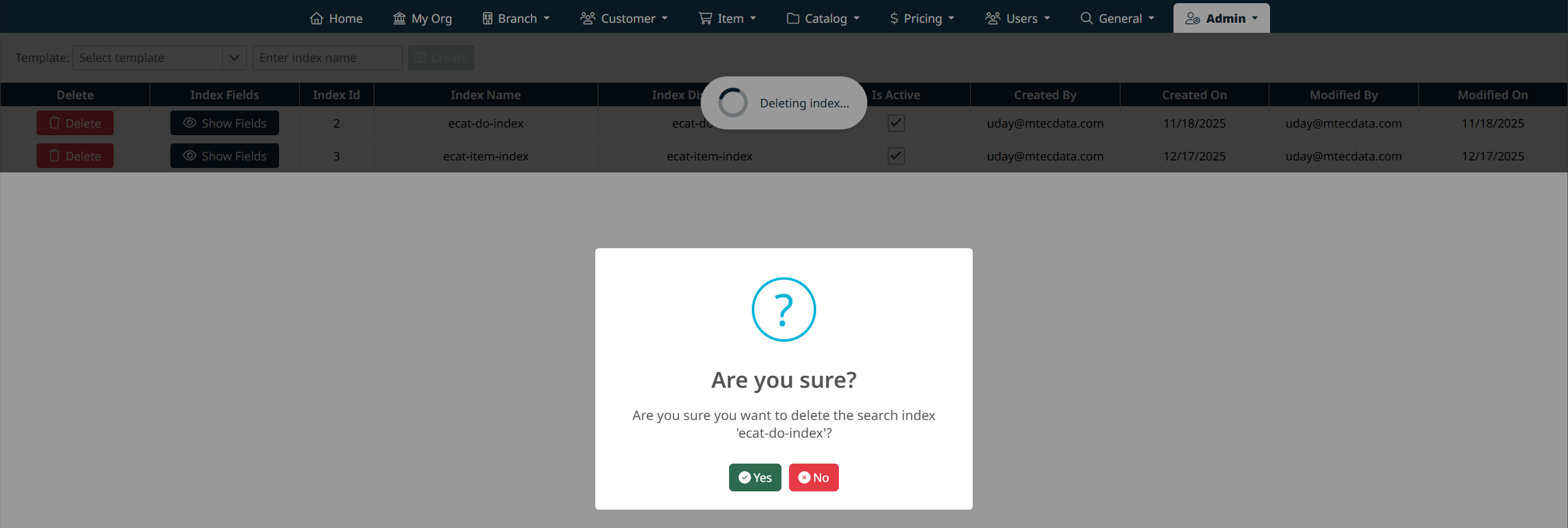 Deleting an index temporarily removes search and facets from the PunchOut eCatalog until the index is re-created.