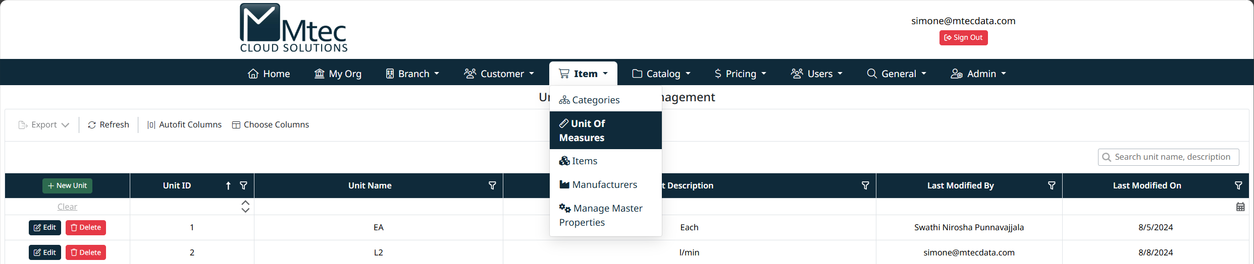 Each row also provides action buttons to Edit or Delete the unit.
