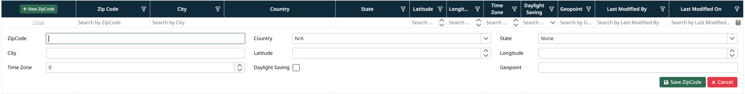 - Column filters for zip code, state, country, and modification details