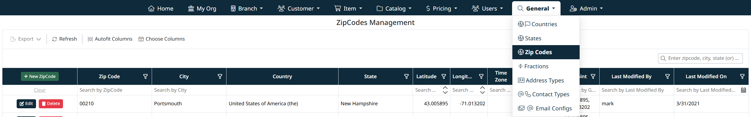 Note: Zip codes that are currently used by customer addresses or site records may not be deletable.