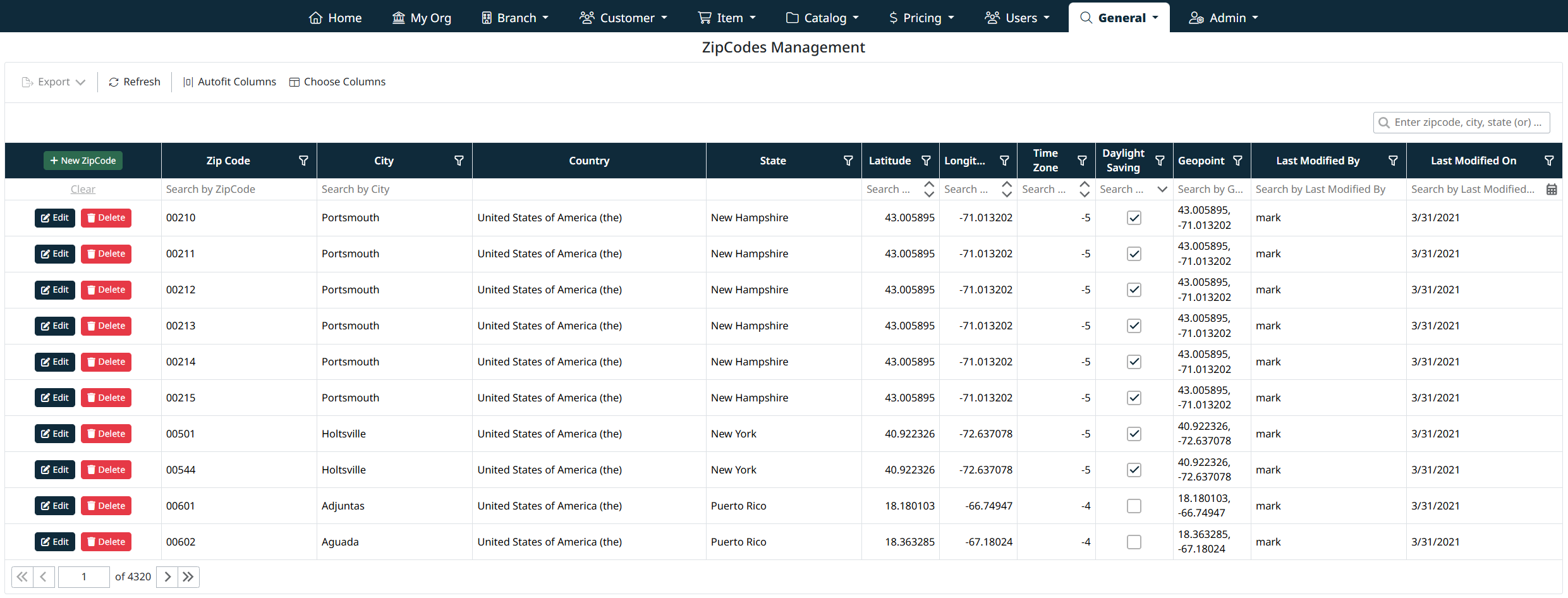 Each row includes Edit and Delete actions to manage individual zip code records.